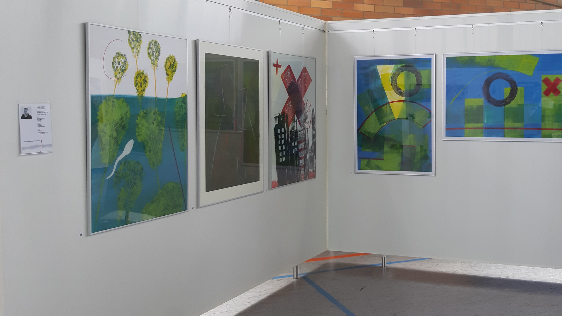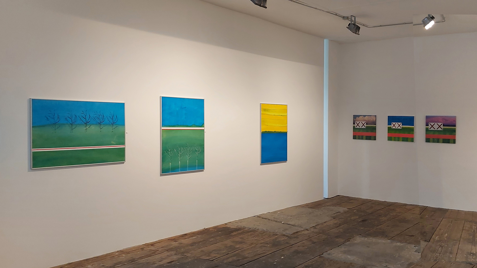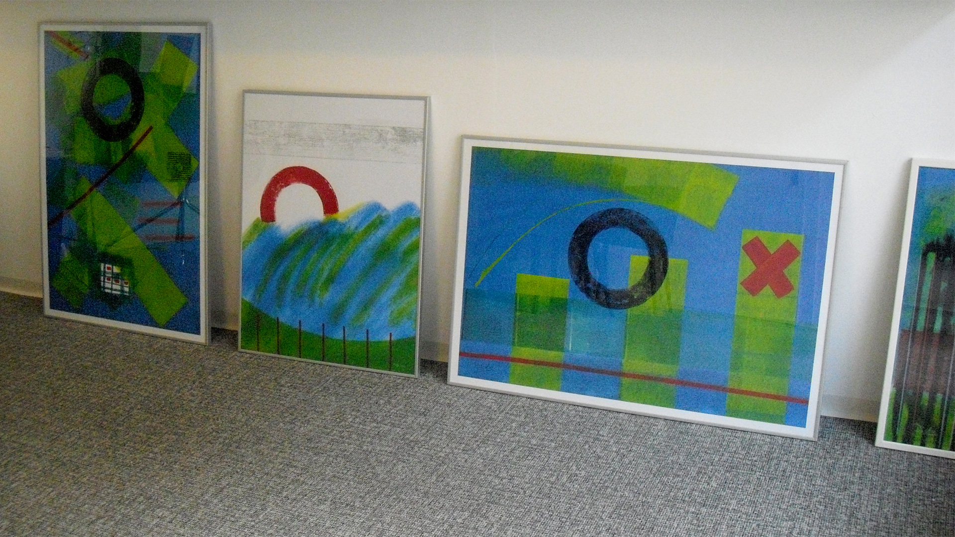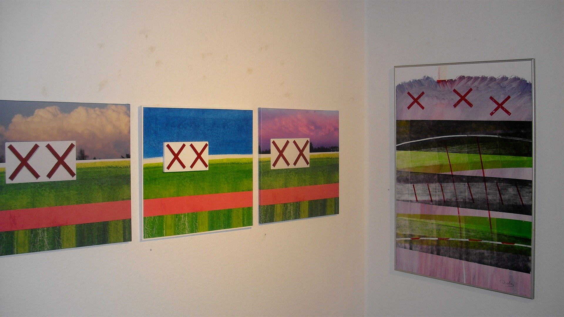 Der erste Strich oft eine Horizontale, drei Linien vertikal, radikal.Irgendwo ein Kreis oder Quadrat. Oben durchkreuzt oder Farbe, unten eine Figur oder nicht.So entstehen meine Landschaften, oder nicht. Oft mit Zeigefinger und immer Spaß dabei.
